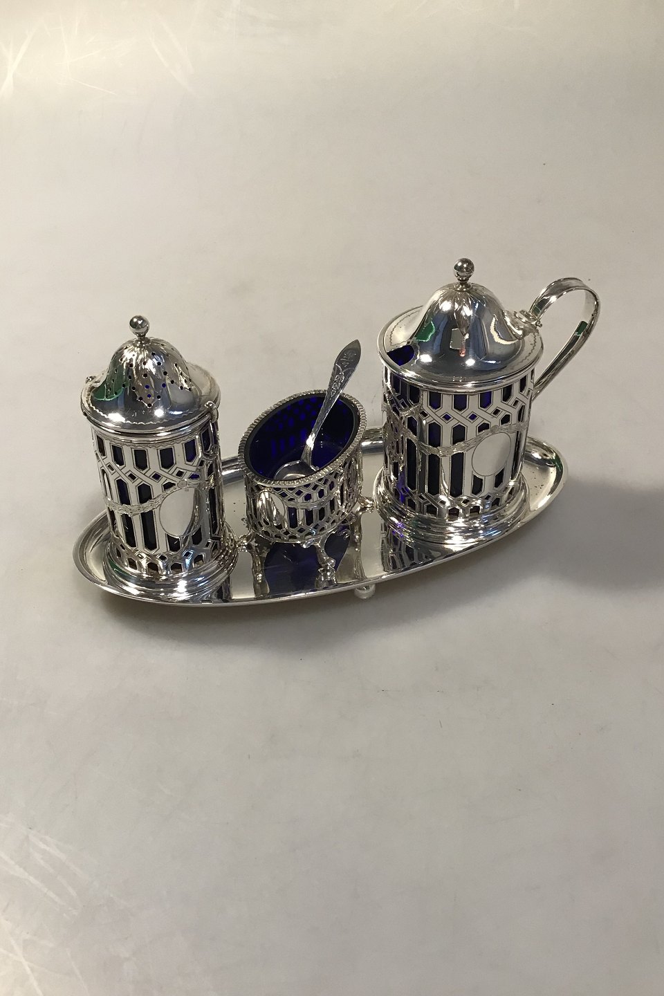 Beskrivelse: P. Hertz Sølv Plat-de-ménage Sennepskrukke, Peberbøsse og saltkar samt bakke Med blå glasindsats og saltske Lidt korrosion på bakke Graveringer Vægt samlet 375 gr/13.26 oz