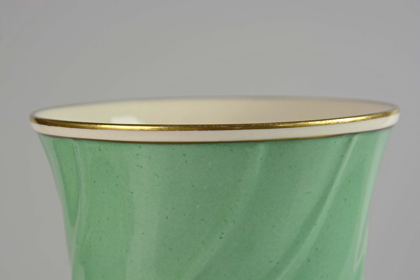 Beskrivelse: Sjælden svejfet vase i mintgrøn farve med gyldne kanter