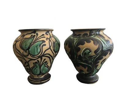 Beskrivelse: 2 vaser med hornmalet dekoration af bladværk i grønne farver