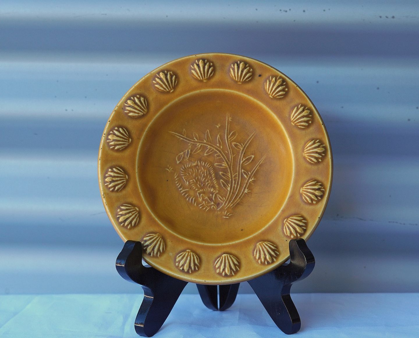 Beskrivelse: Rundt, karry-gult fad, med et pindsvin på