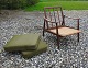 Beskrivelse: Lænestol i teaktræ med polstret hynder i grønt uldstof