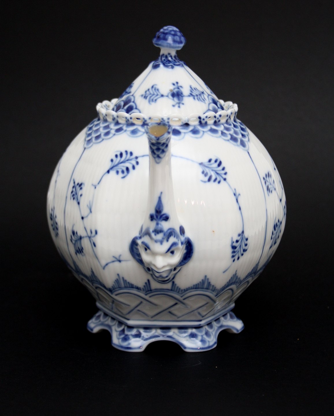 Beskrivelse: Royal Copenhagen, Musselmalet helblonde, Tekande med låg. Formnr. 1-1118. Dateret 1950. Højde 17,5 cm. Længde 18 cm. I. sortering. Perfekt stand. Pris: SOLGT