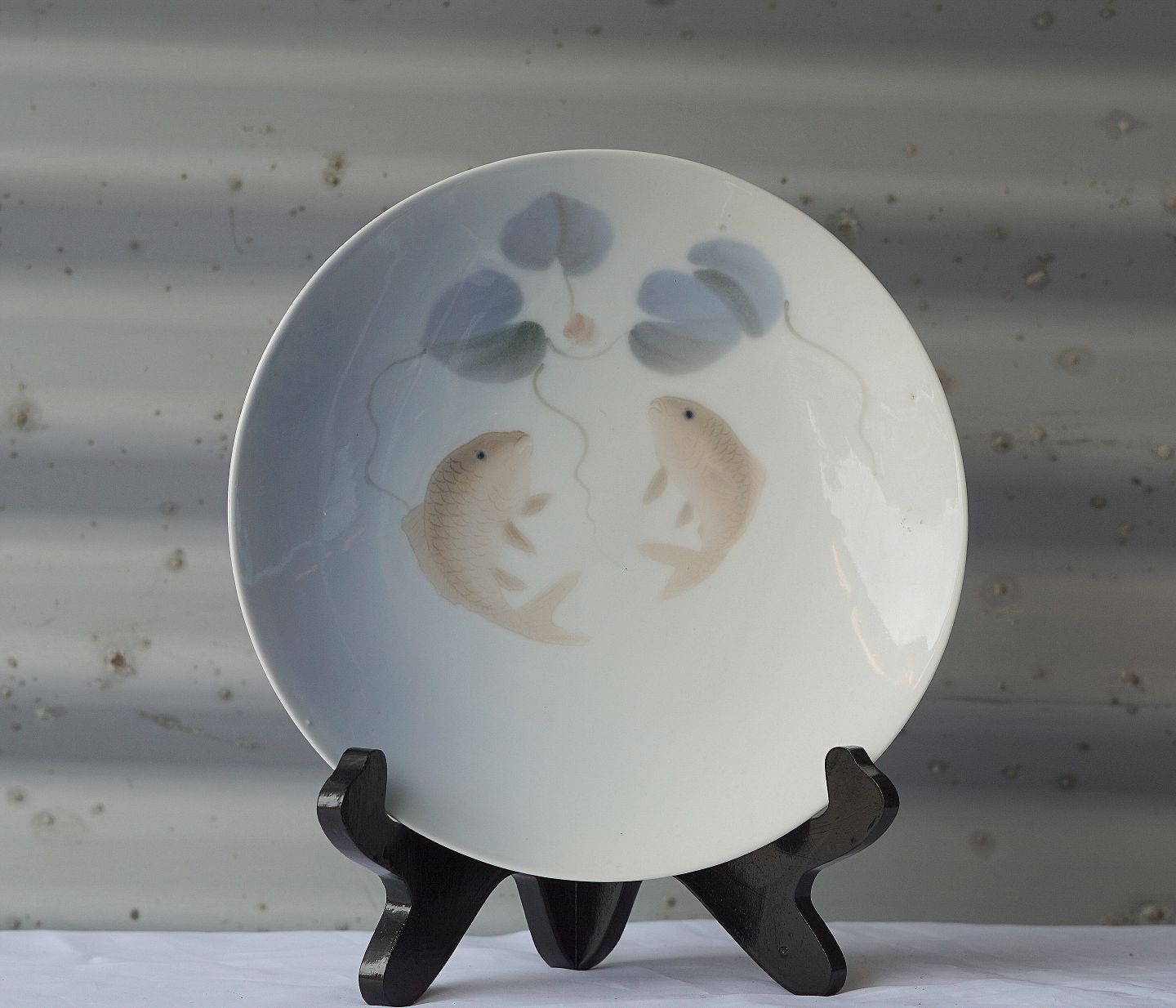 Beskrivelse: Lyseblå platte med fisk. Den Kongelige platte er lavet ca. 1893-1898