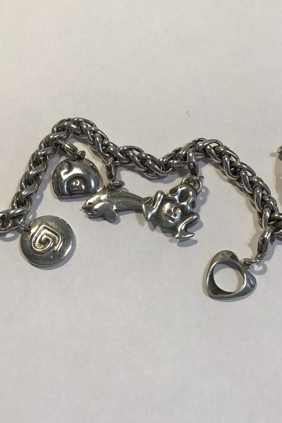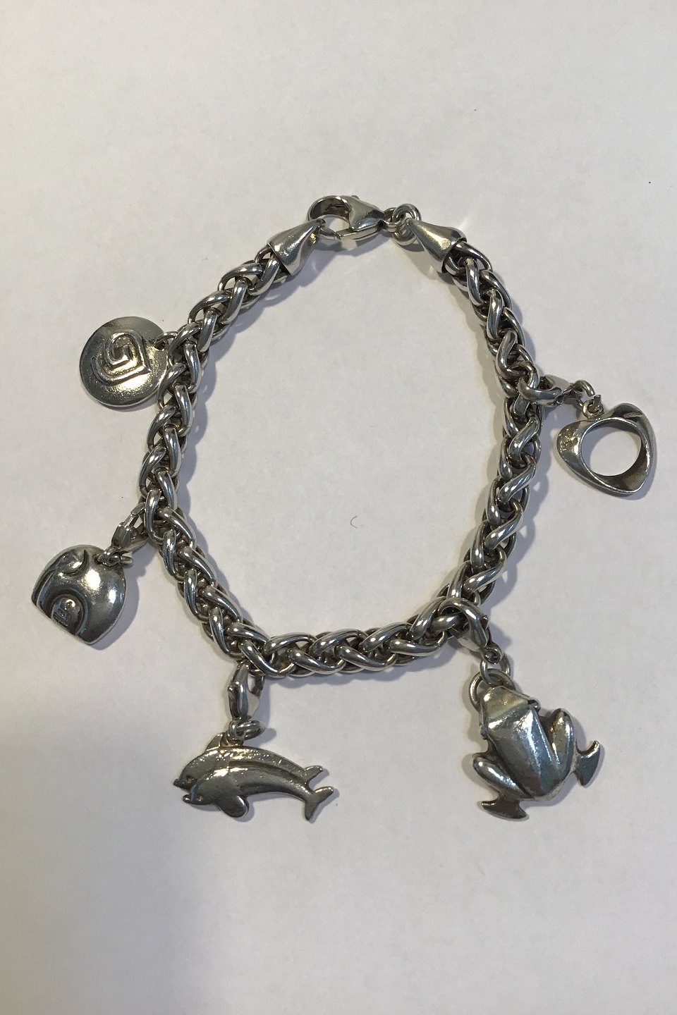 Description: Georg Jensen Sterling Silver Charm Bracelet. With charms: Frog, Elephant, Dolphins, a Henning Koppel Heart and a Georg Jensen Logo . Measures 20.5 cm L (8 5/64"). Weighs 46.7 grams (1.64 oz).