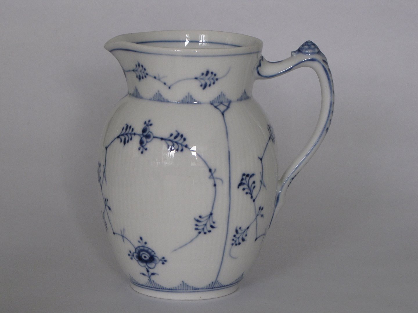 Beskrivelse: Musselmalet Riflet stor mælkekande 1 L. fra Royal Copenhagen. Nummer 161. 1. sortering. Højde 18 cm.