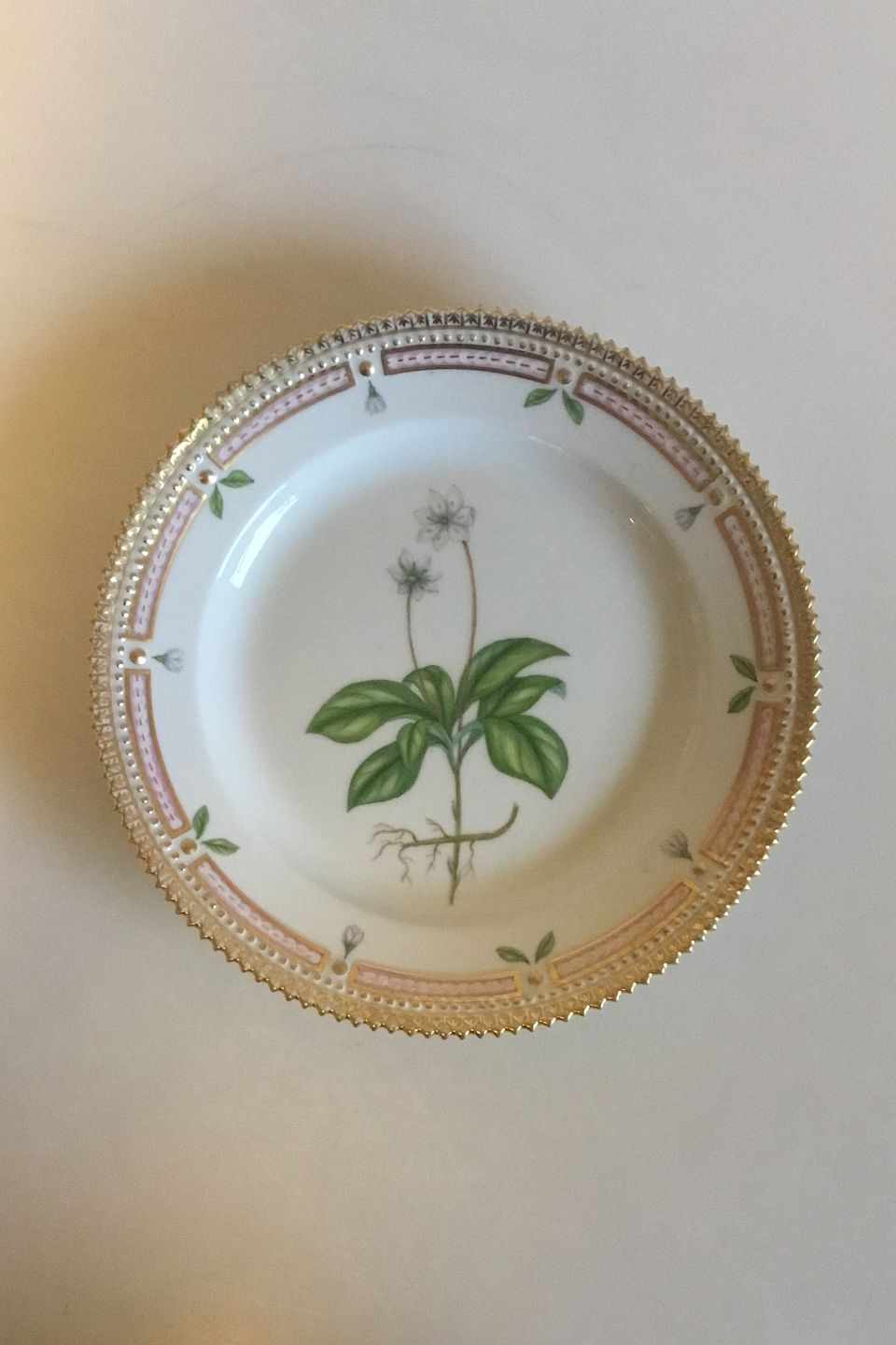 Beskrivelse: Royal Copenhagen Flora Danica Salat Tallerken No 20/3573. Latinsk navn: Trientalis europaea L. Måler 19,2 cm