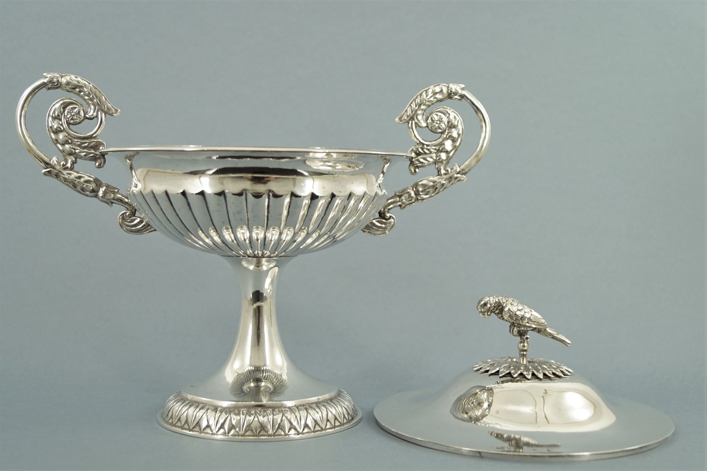 Svensk cirkulær opsats af sølv med låg. Opsatsen er prydet med to håndtag, låget prydet med en papegøje.