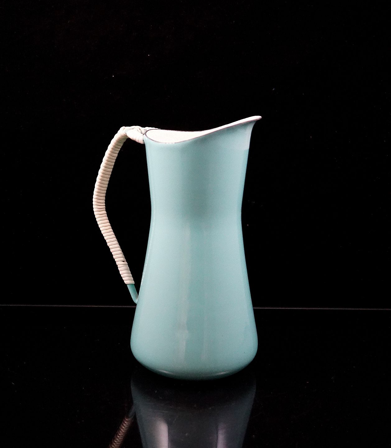 Beskrivelse: Kande i turkis og hvid emalje med plastflet på hank