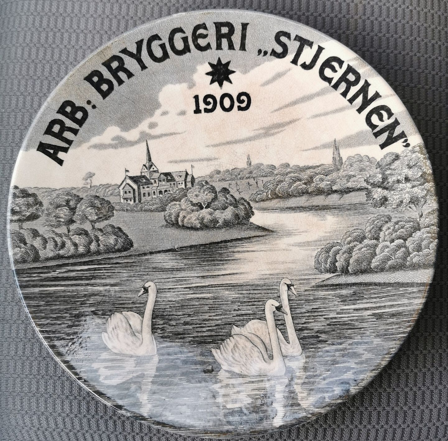 Beskrivelse: Arbejdernes bryggeri A/S: Bryggeriet "Stjernen" 1909. Platte i faiance fra Aluminia fabrikken 1909. Fremstår i god stand. Fabriksmærket indstemplet på bagsiden: ALUMINIA. Mål: Ø. 19 cm