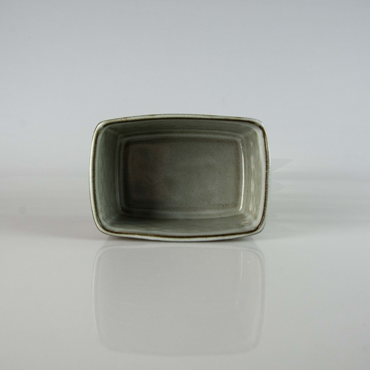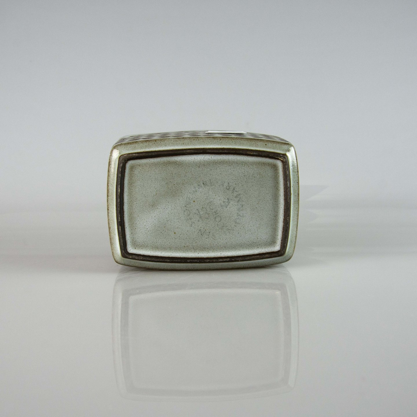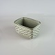 Smørkrukke i gråt stentøj med abstrakt motiv.