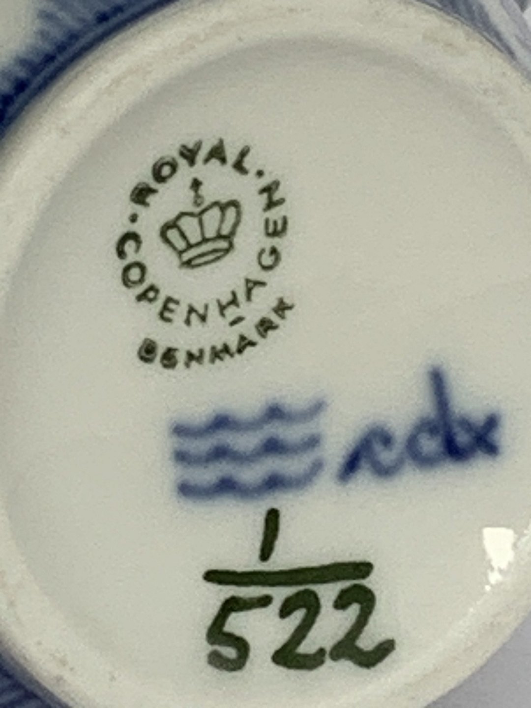 Beskrivelse: Musselmalet Halvblonde fløde kande fra Royal Copenhagen Nr. 522. Højde 10,5 cm. 1. sortering