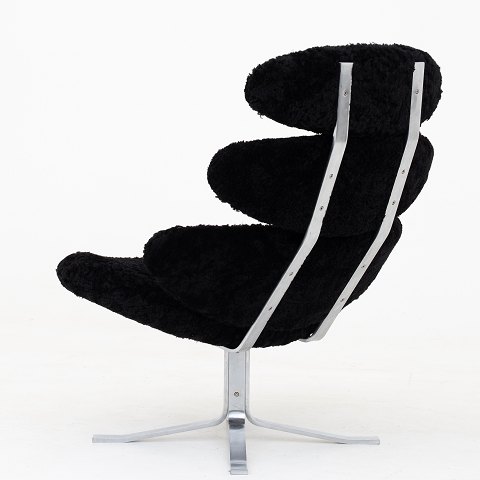 EJ 5 - 'Corona' lænestol med tilhørende skammel i stål og nybetrukket i sort lammeuld.