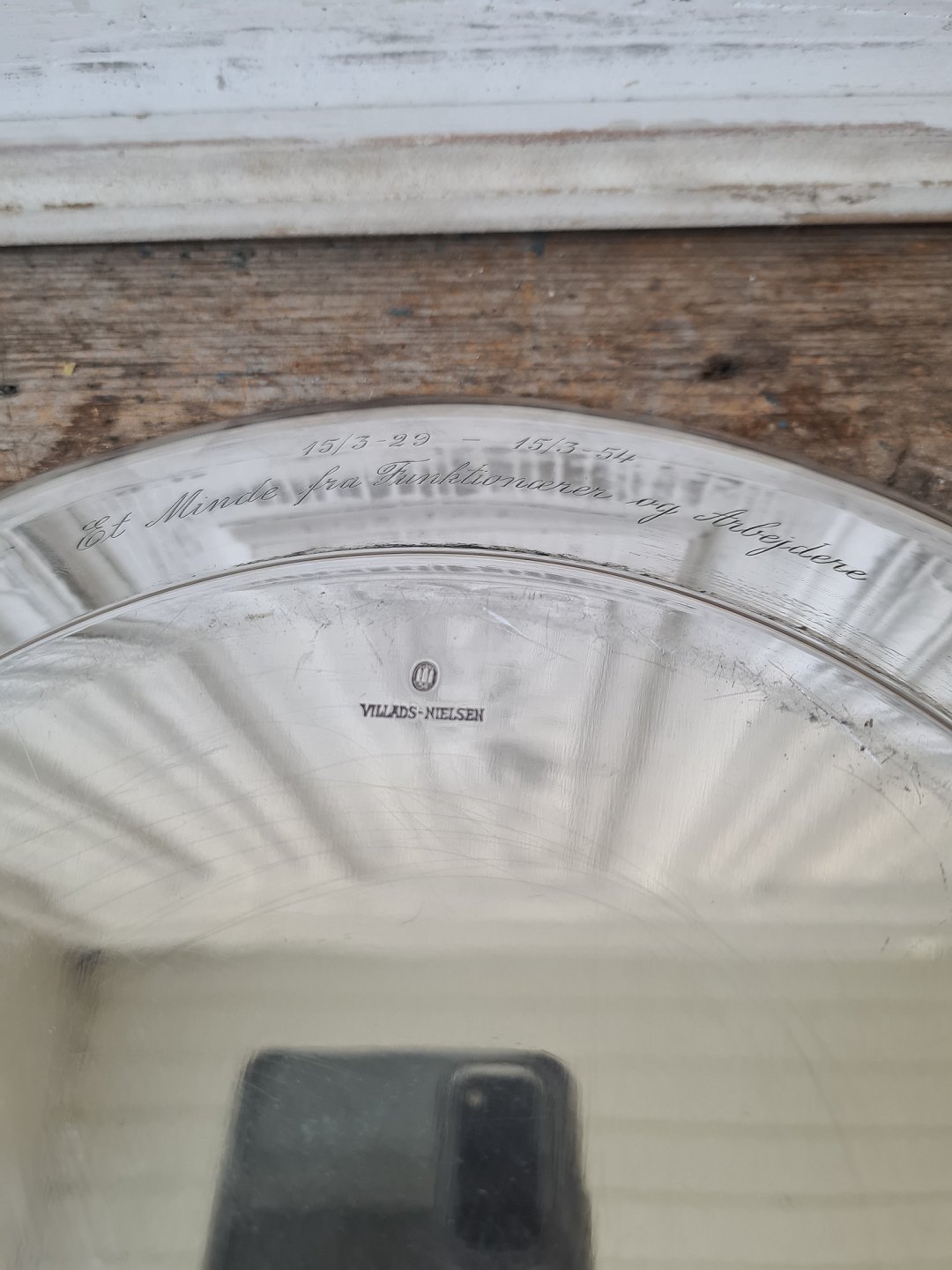Beskrivelse: Sølv fad med perlekant fra 1954 af Villads-Nielsen