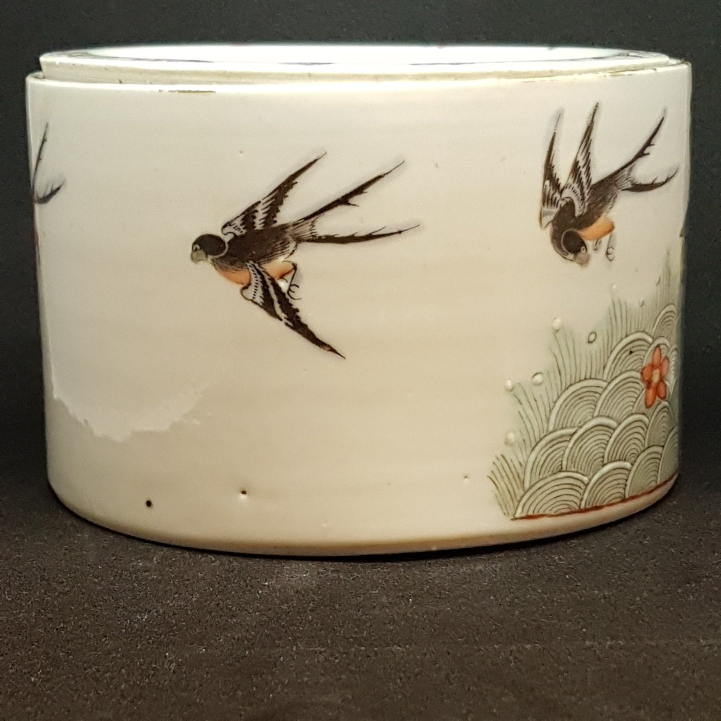 Chinese lidded jar in porcelain. Decorated with birds. Lid with a leaf in silver and cloisonne, that is used as a handle.