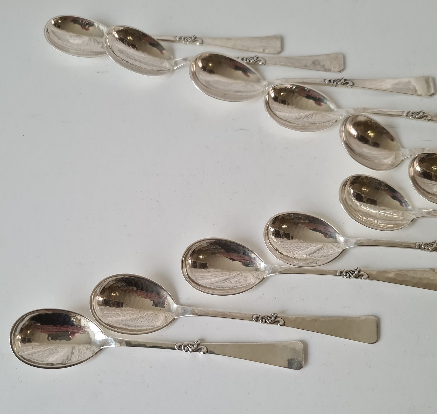 Sæt på 11 kaffeskeer i hammerslået sølv produceret af Heimburger