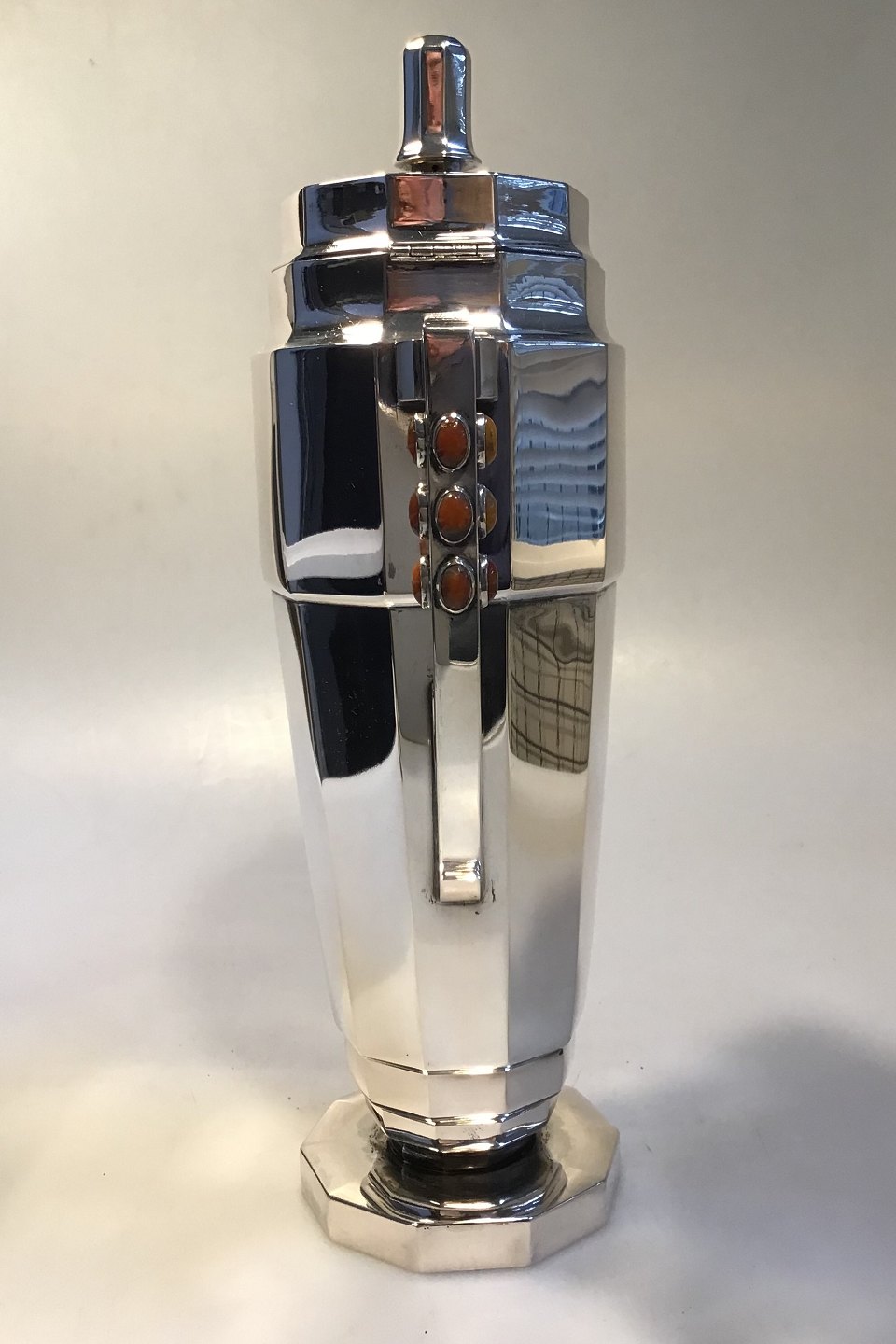 Beskrivelse: A Dragsted Art Deco sølv Cocktailkande (1911) Høj ligeknækket korpus indvendigt lueforgyldt. Hank udsmykket med 12 ovale ravperler. Måler H 33 cm. (13 in) Vægt 732 gr /25.80 oz