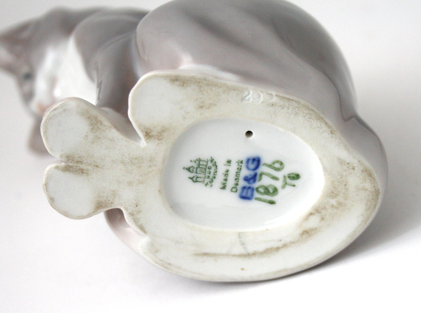 Beskrivelse: Bing & Grøndahl, Siddende grå kat med hvidt bryst og hvide poter. Nr. 1876. Designet af Ingeborg Plockross Irminger. Højde 12 cm. II. sortering. Pris: SOLGT