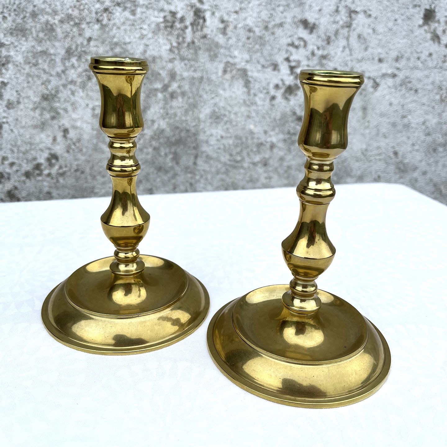: Messing lysestage sæt, 14,7cm høj, 10cm i diameter *Pæn brugt stand*