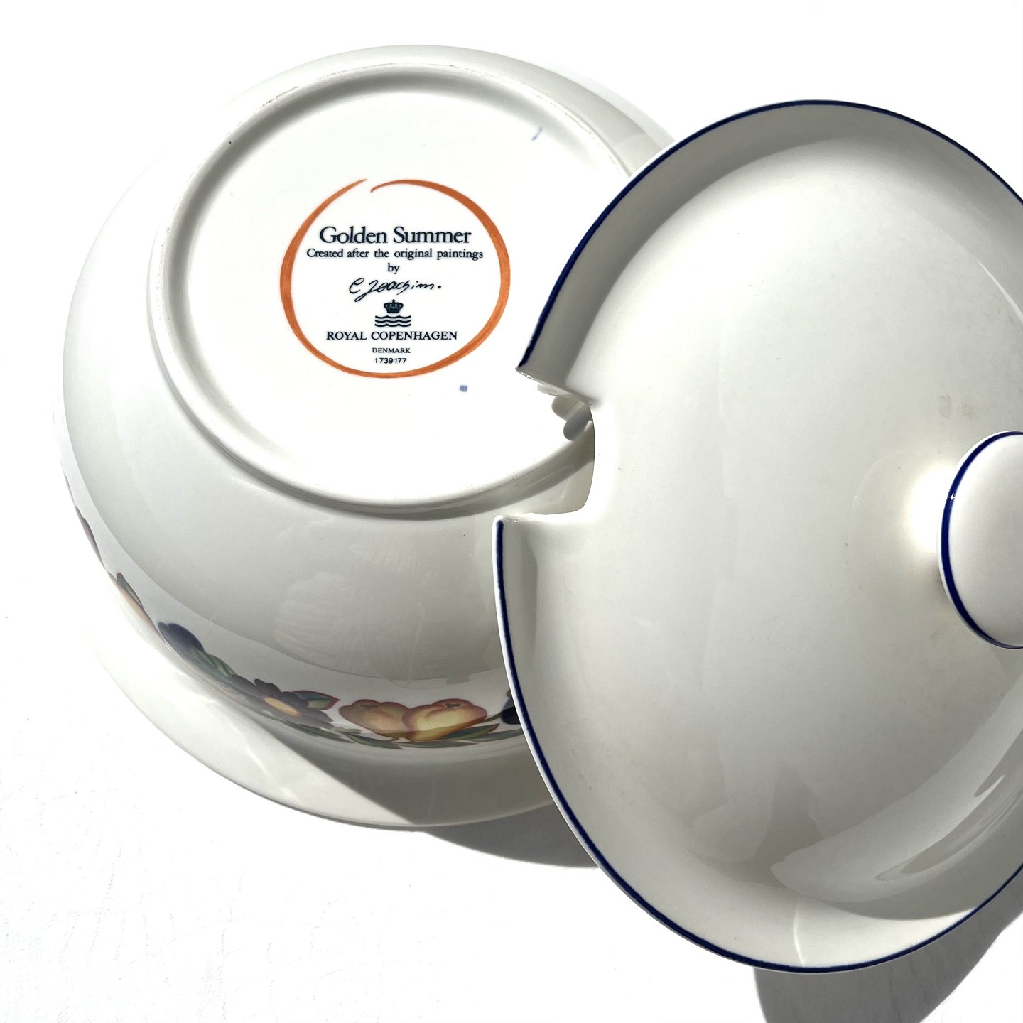 Beskrivelse: Royal Copenhagen, Gylden sommer, Terrin med låg, #1739/177, 25,5cm i diameter, 17,5cm høj, 1.sortering, Nyfortolkning af Christian Joachim's design *Perfekt stand*