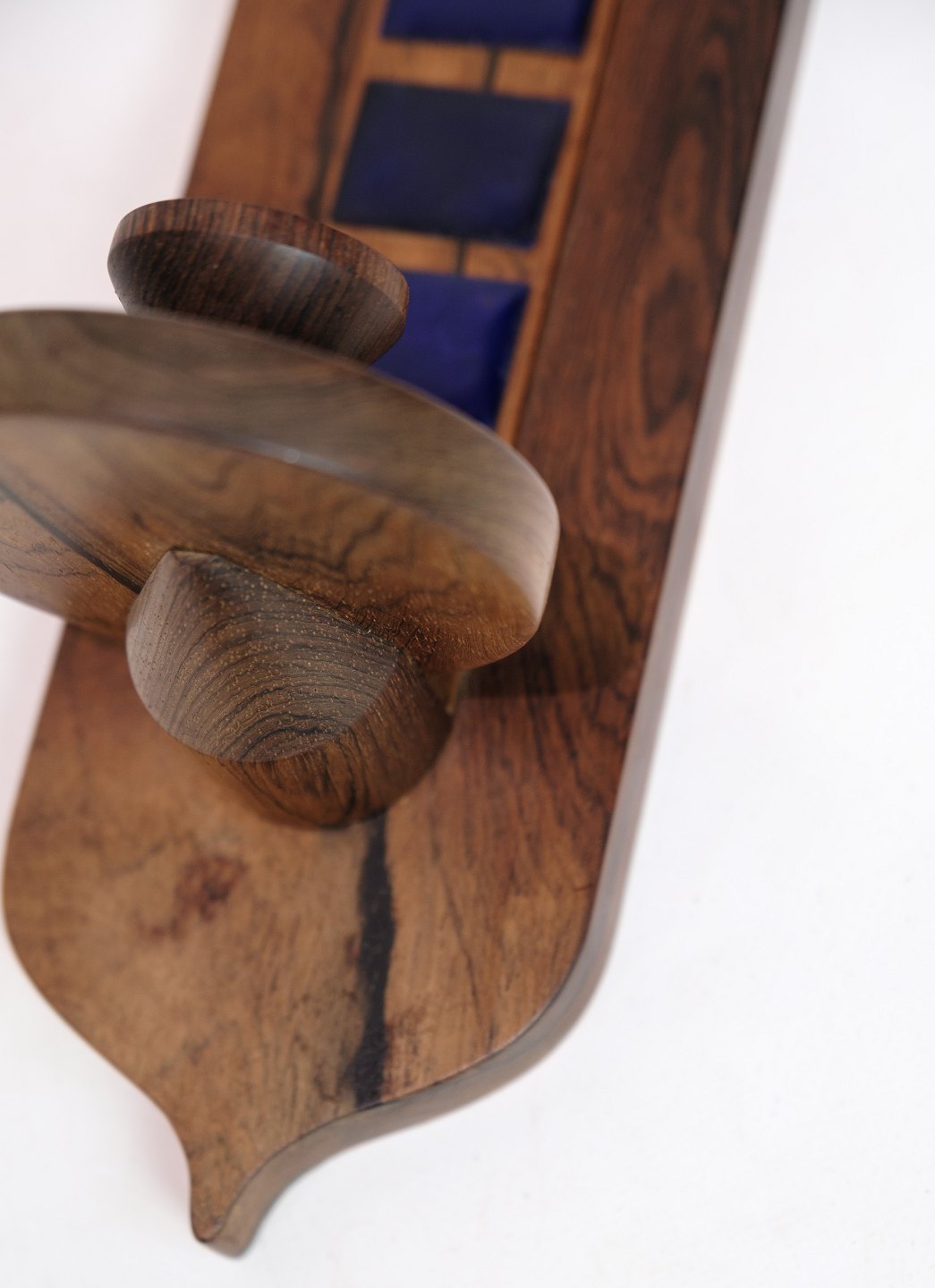 Beskrivelse: Væglysestage i træsorten palisander med indlæg i blålige farver fra omkring år 1960'erne.