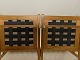 Beskrivelse: Hans J. Wegner lænestol designet i 1969. Lænestol af patineret egetræ med nye gjorde. Hynder polstret med original lys blå uld. Stolene er produceret hos GETAMA. Model GE 375.