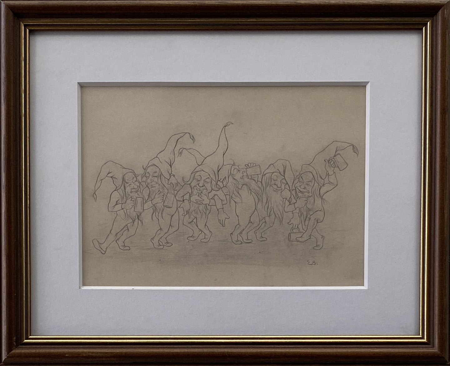 Beskrivelse: Eiler Braae 1878-1914. Blyant tegning med passepartout i sort ramme. Motiv af 6 dansende nisser.