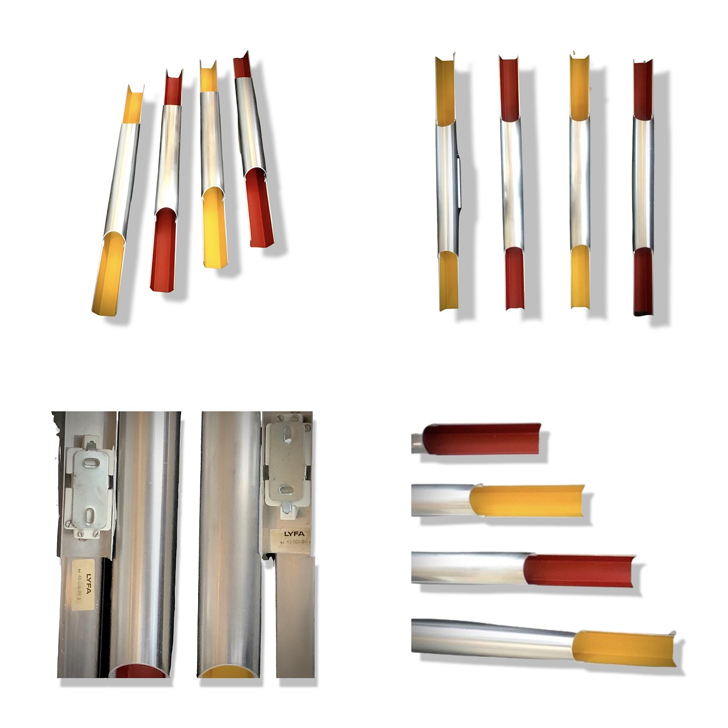 Beskrivelse: Bent Karlby / Lyfa: Par Pan-opticon væglamper af aluminium. 2stk røde. De gule er solgt.