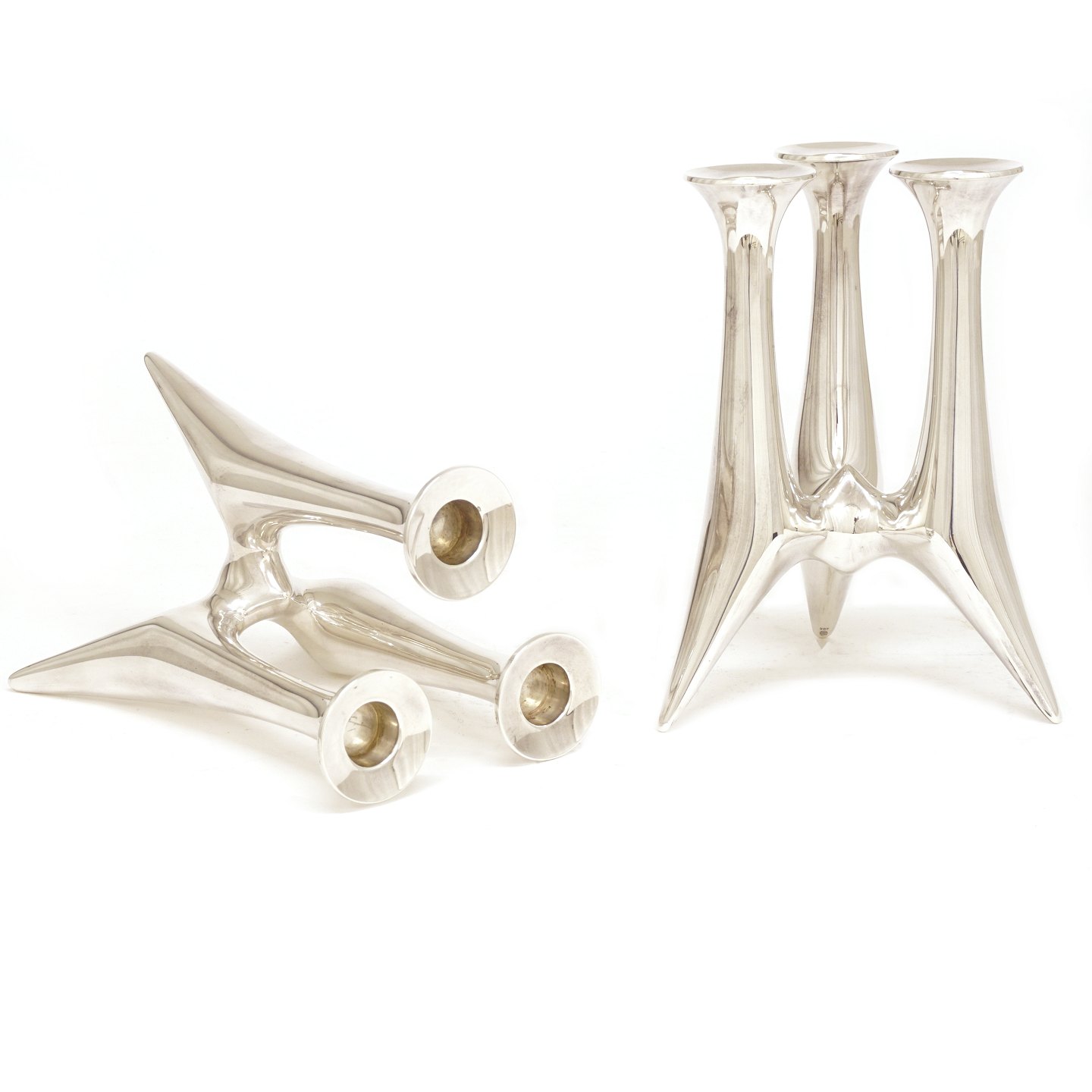 Hans Hansen lysestager. Et par trearmede lysestager i sterlingsølv. Stemplet Hans Hansen. #494. Anno 1958. H: 18,5cm. V: 943gr