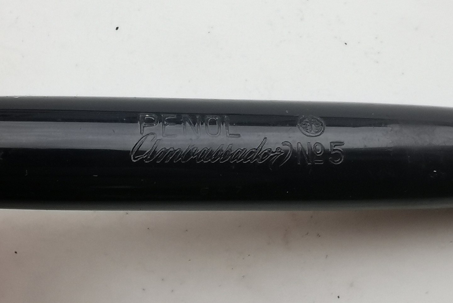 Beskrivelse: Sort Penol Ambassador nr. 5 fyldepen. "Push button".påfylder. fremstår I god stand. Ingen skader eller reparationer. Fint fabriksmærke på kroppen. Alle dele er originale Penol. Fyldepennen fungerer ikke. Ved ekstra betaling på d.kr. 325,- indsættes ny gummisæk, så den igen bliver dunktionsduelig. Mål: L. 13,5 cm