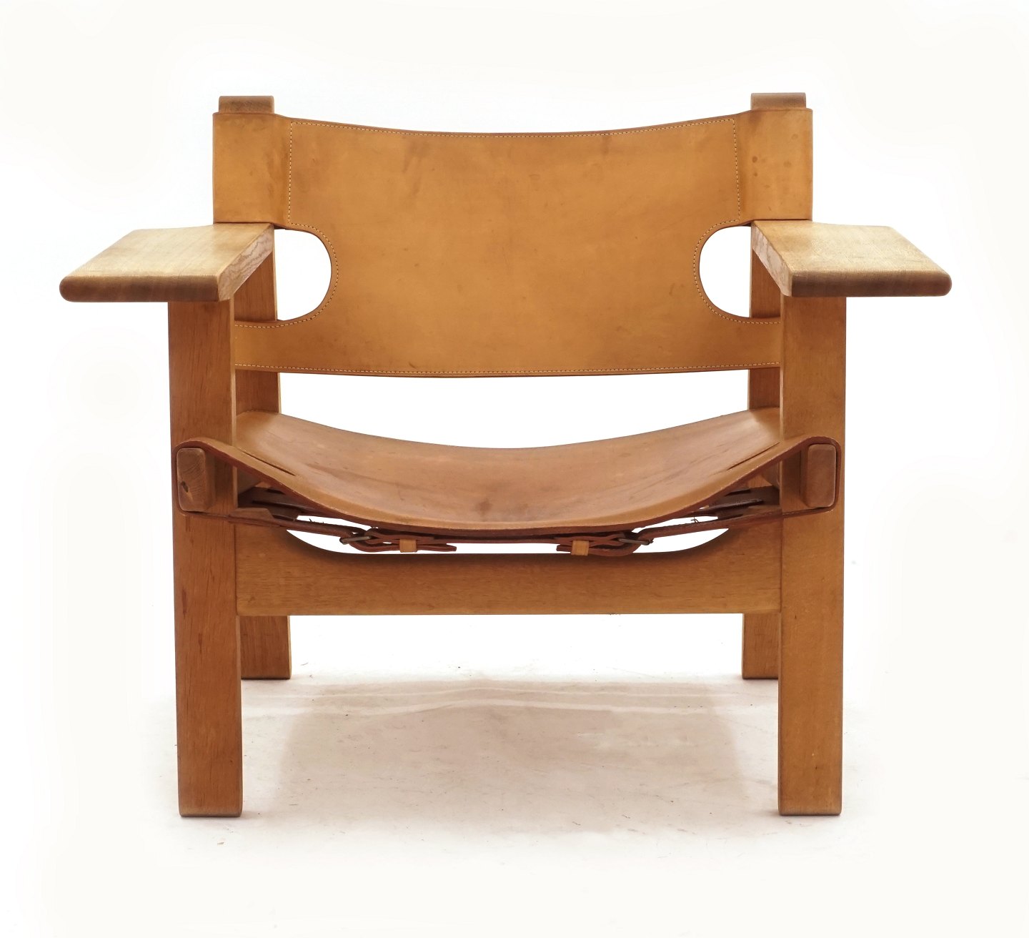 Beskrivelse: Den Spanske Stol af Børge Mogensen med egetræsstel og originalt cognacfarvet kernelæder
