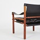 Beskrivelse: Et par safaristole af Arne Norell, model 'Sirocco'. Stel af massivt bejset asketræ. Ryg, sæde samt armlæn af udspændt sort læder. Løse hynder betrukket med knapsyet sort læder. Prisen er for 2 og sælges kun samlet.