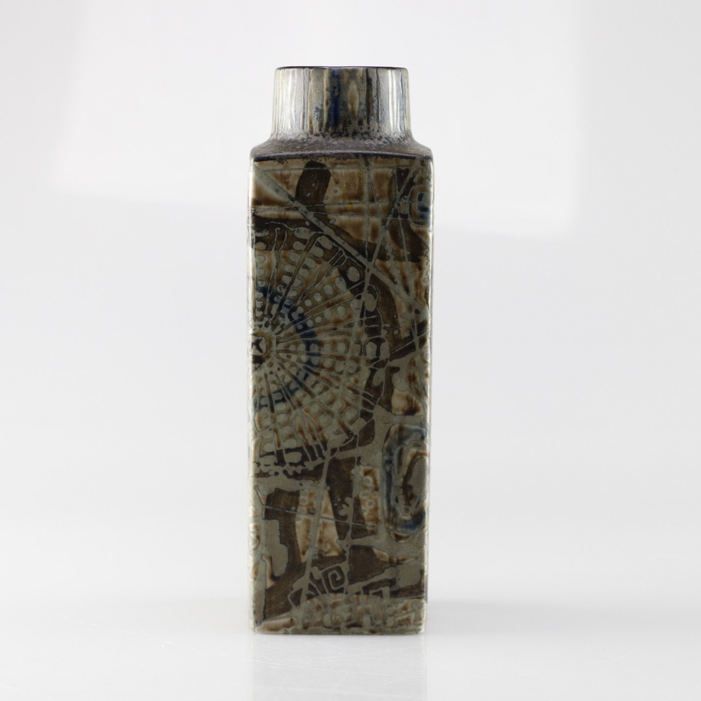 Kvadratisk vase med et kunstværk af brunlige farver