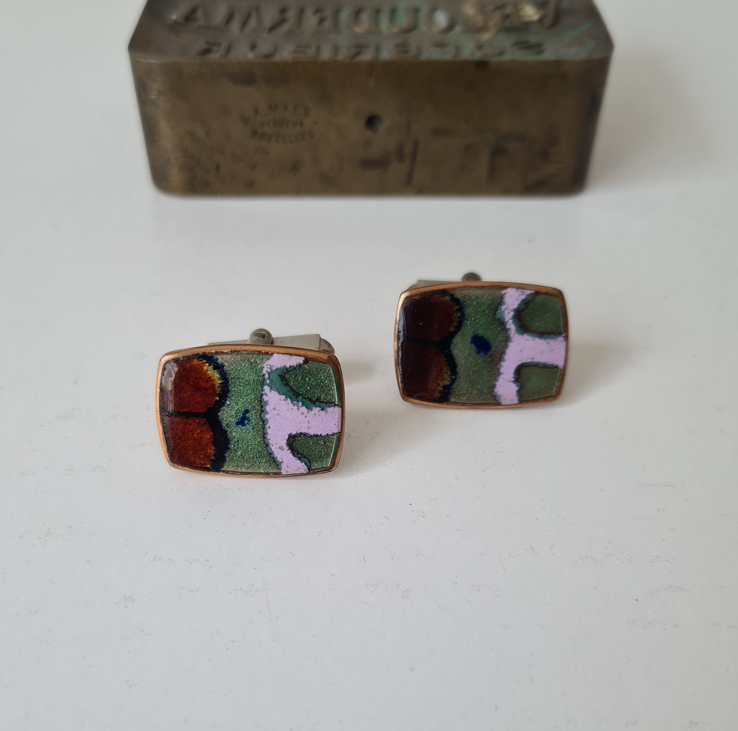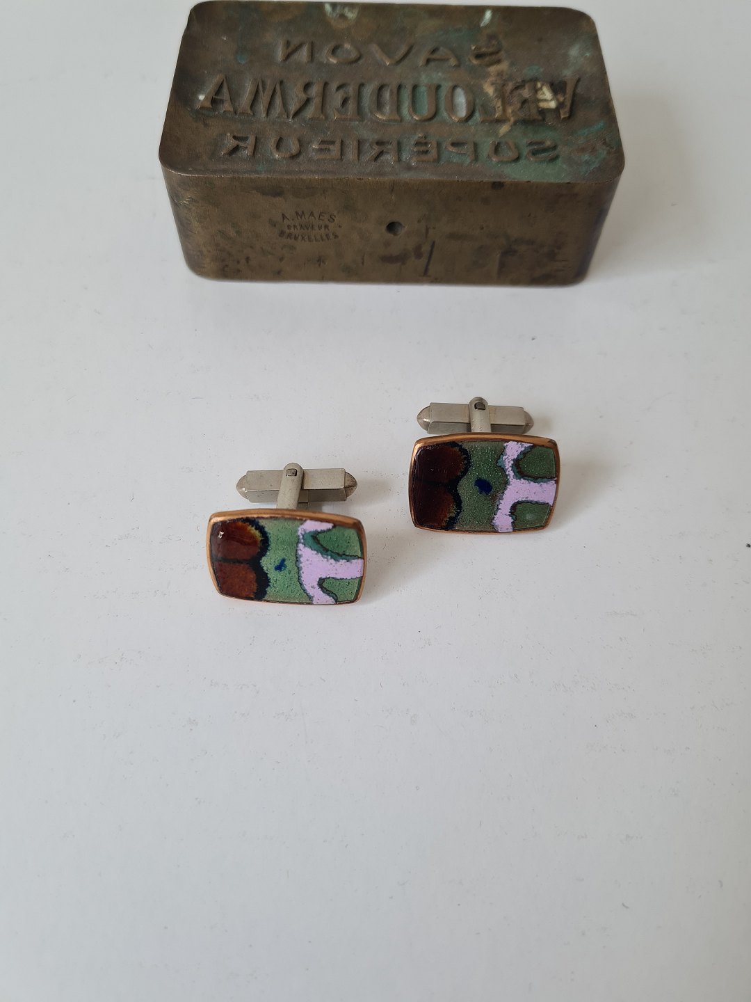 Beskrivelse: Par manchetknapper i metal med flot emaljearbejde