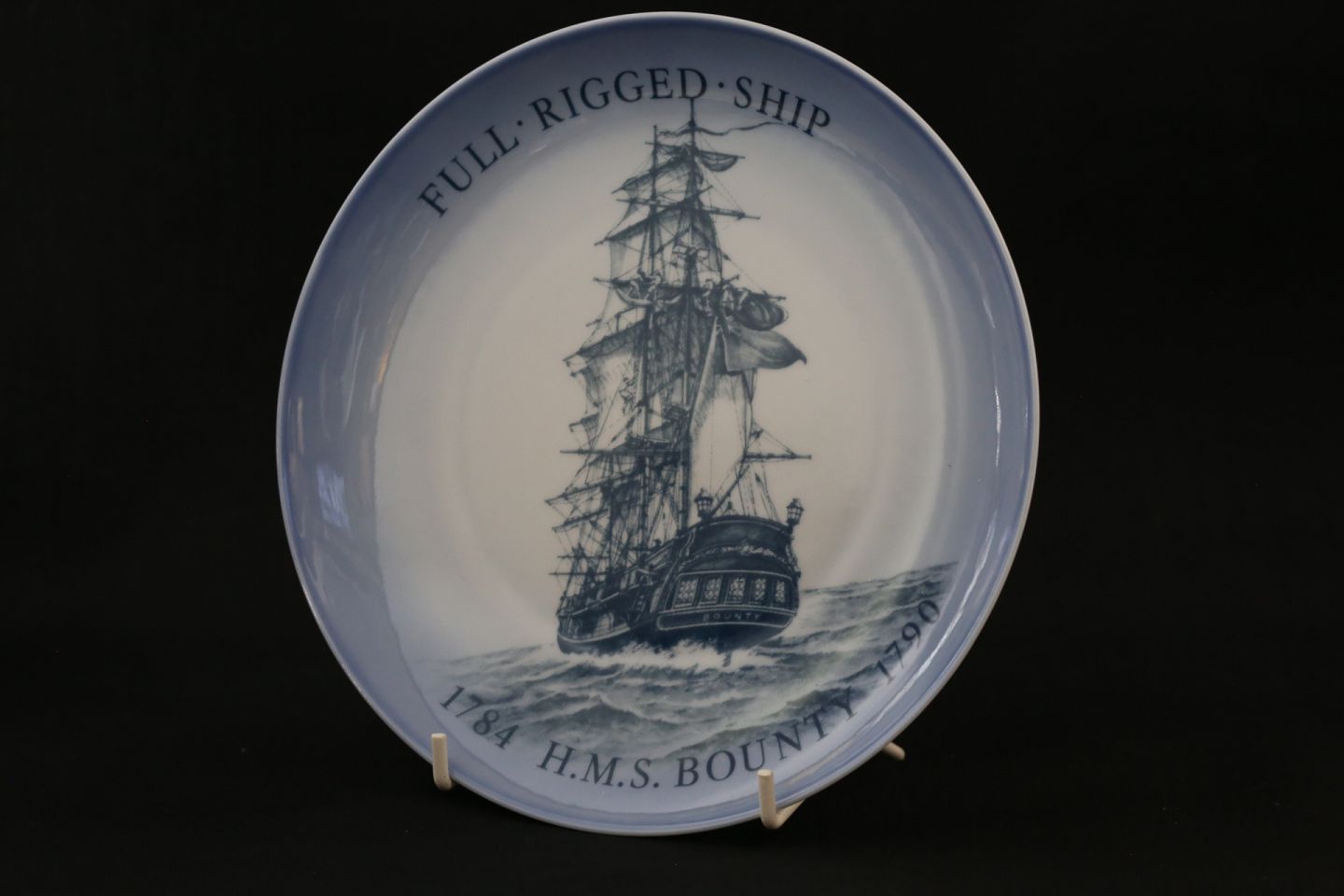 Beskrivelse: Skibsplatte Bing & Grøndal, No. 5, fra 1983. Platten er bemalet med Full Rigged Ship, med teksten 1784 H.M.S. Bounty 1790. Der er tekst om skibet på bagsiden af platten.