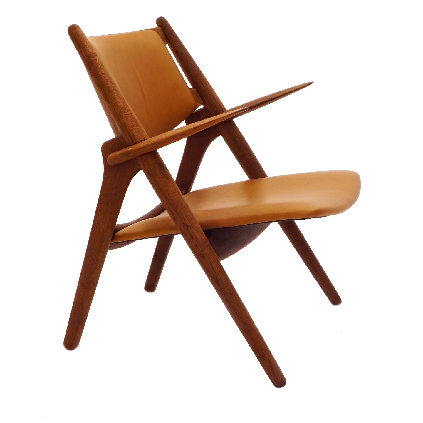 Hans J. Wegner, 1914-2007, Savbukkestol med armlæn i patineret eg med cognac farvet læder