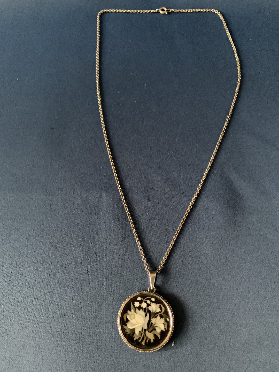 Beskrivelse: Smuk sølvkæde med vedhæng. Vedhænget er med indlagt blomstermotiv. Vedhængets flotte motiv og udførelse, gør dette smykke meget elegant at bære. Blomsterne i vedhænget er udført meget detaljeret.