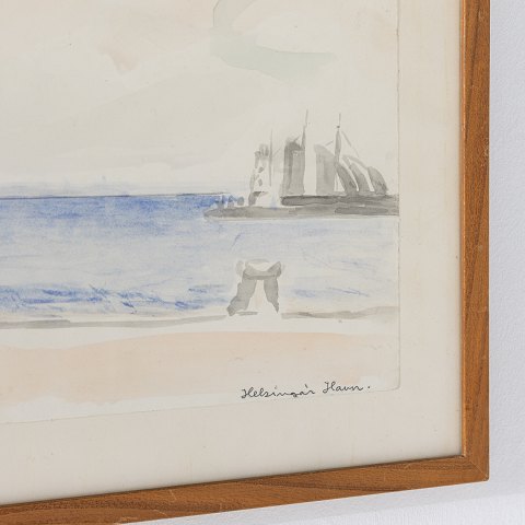 Watercolour in pastel colours in a wooden frame. Motif of Elsinore Harbour from July 1949. Signed.