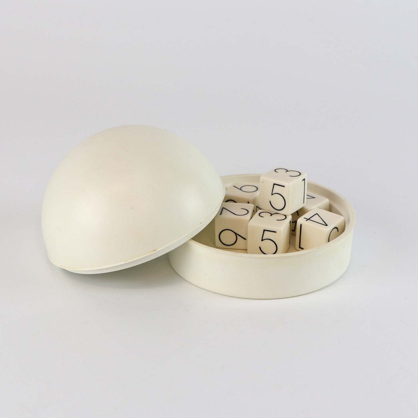 Beskrivelse: Raflebæger i hvidt plast med 6 terninger