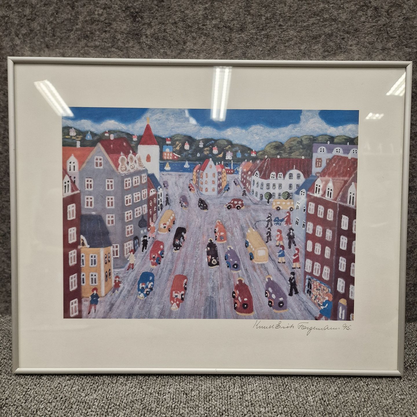 Beskrivelse: Indrammet tryk i aluminiumsramme i naivistisk stil af Aalborg.