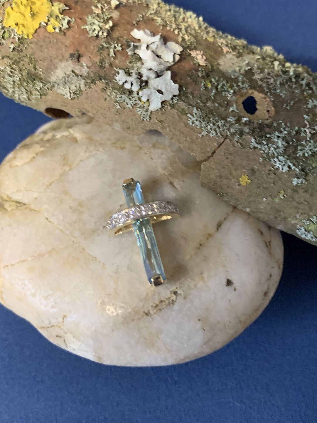 Beskrivelse: Meget smukt og unikt lille vedhæng i 14 karat guld. Smykket er formet som et kors, hvor den lodrette del er opbygget af guld, med en flot klar sten i midten. Det tværgående bånd er ligeledes besat med små klare sten. Et meget unikt vedhæng, der med fordel kan kombineres med en tynd guldkæde.