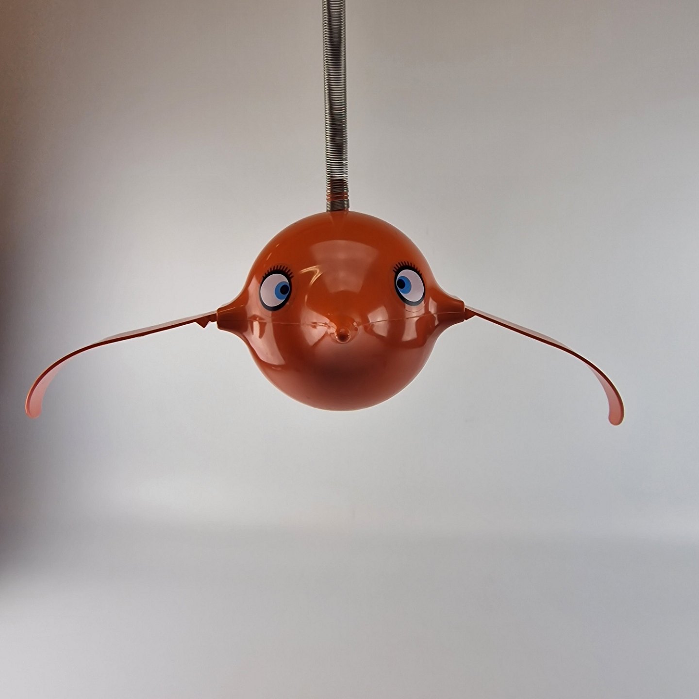 Beskrivelse: Vintage Hoptimist uro model Busy Birdie i rød plast med metal ophæng