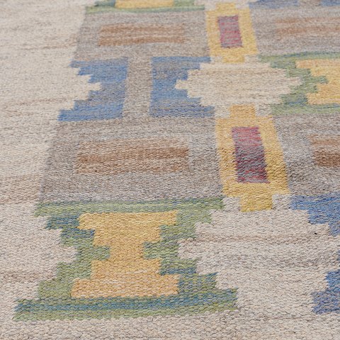 Wool rug, hand-woven 'rölakan' technique and polychrome, in a geometric pattern.