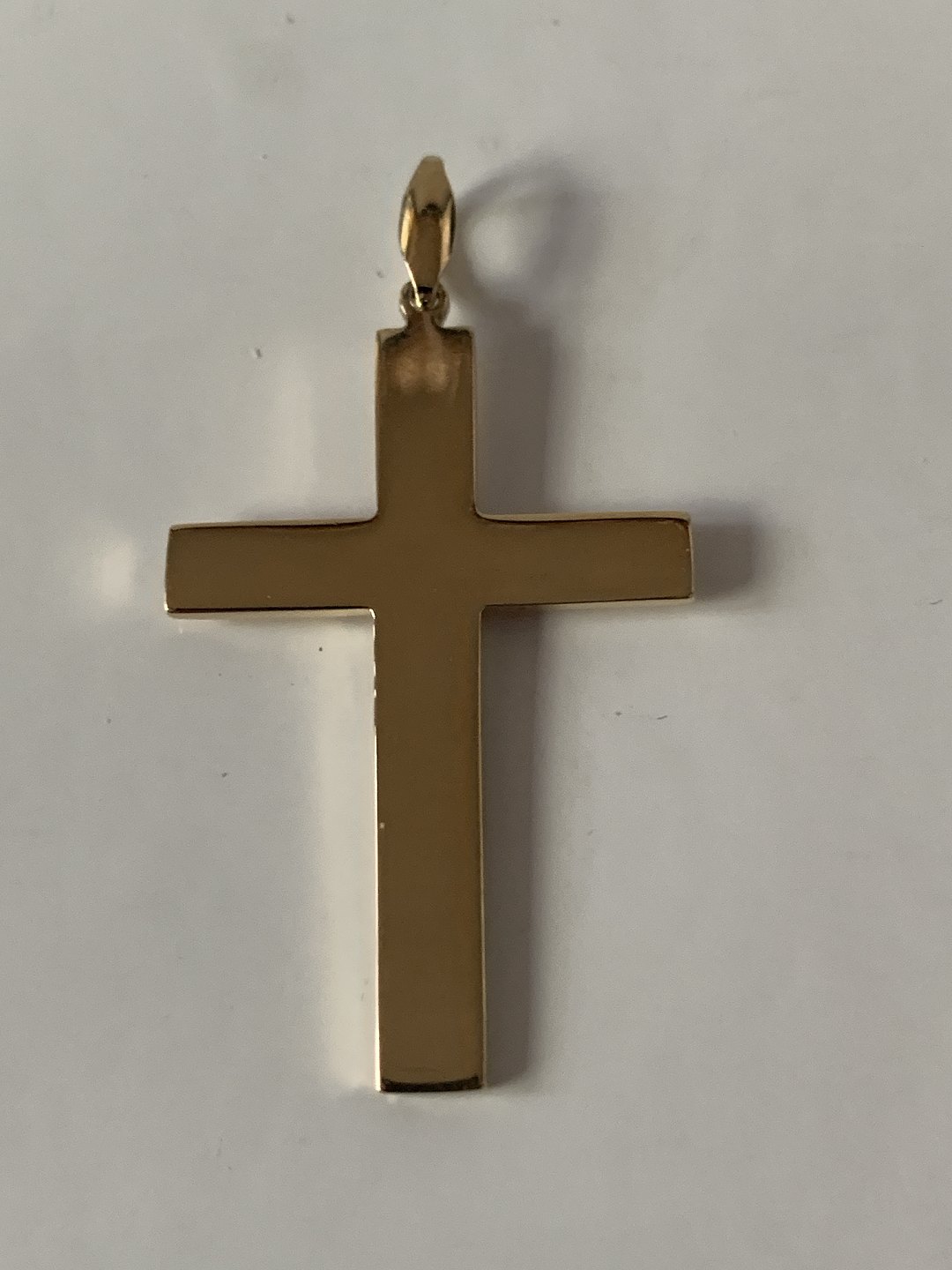 Beskrivelse: Flot og stilrent guldkors til halskæde. Guldkorset lavet i massivt guld, og har en anseelig størrelse. Derfor vil korset bedst passe til en større guldkæde. Korset er lavet i enkelt stil, uden mønstre eller udskæringer. Dette gør guldkorset til et enkelt men alligevel elegant smykke.