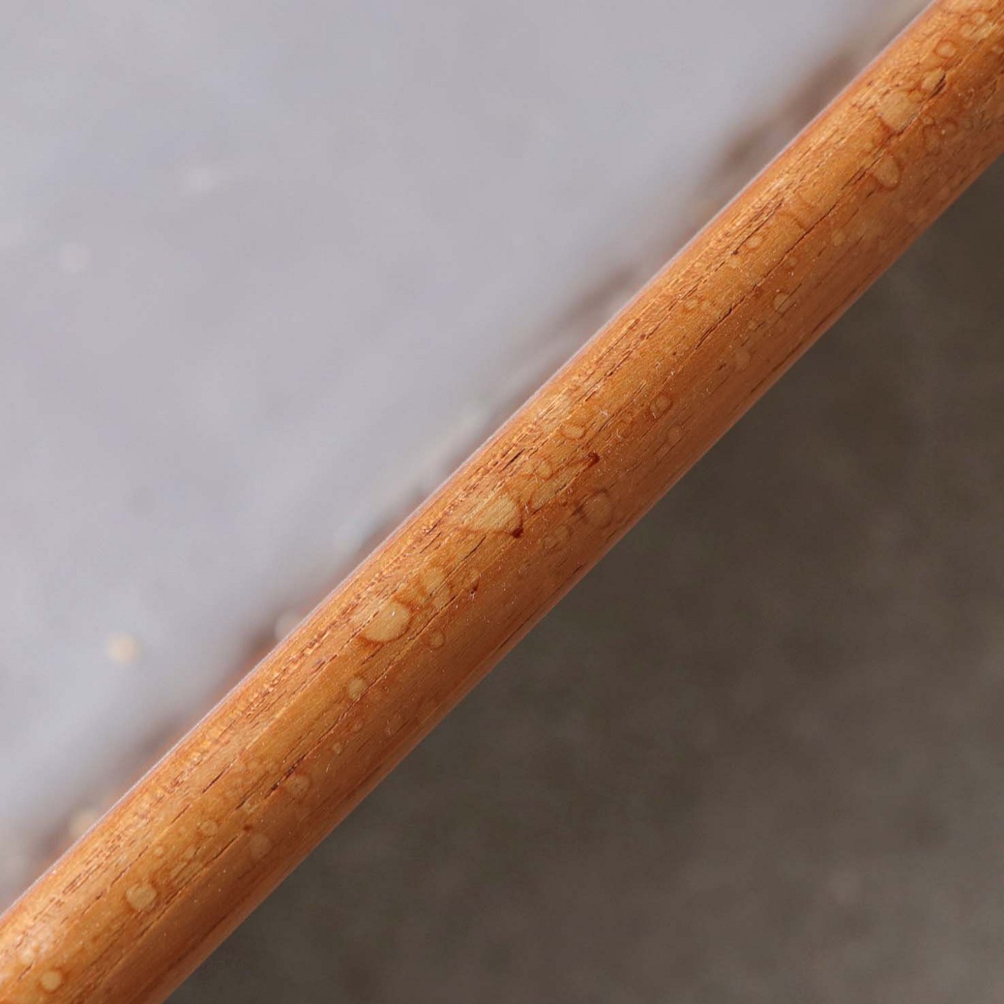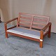 Beskrivelse: To personers sofa med stel i lakeret teaktræ og hynder betrukket med lyst uld stof.