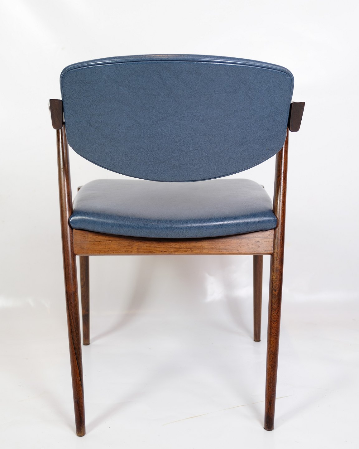 Description: Set of 6 dining table chairs in rosewood with blue leather upholstery, designed by Kai Kristiansen. The chairs have a frame in rosewood, which shows the beautiful grain patterns in the wood, and they are upholstered with blue leather, which is both comfortable and durable.