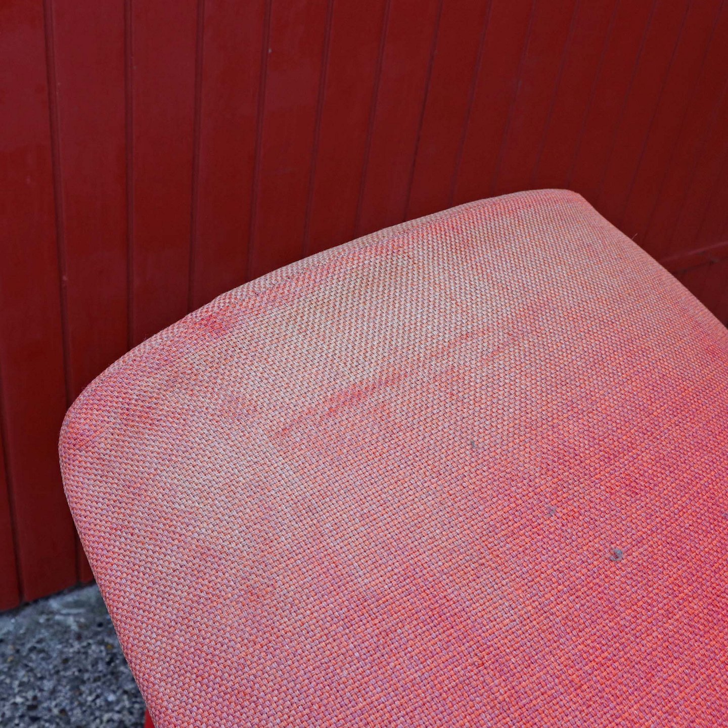Fremstår med solbleget stof og brugsspor på fod. Trænger til ompolstring.