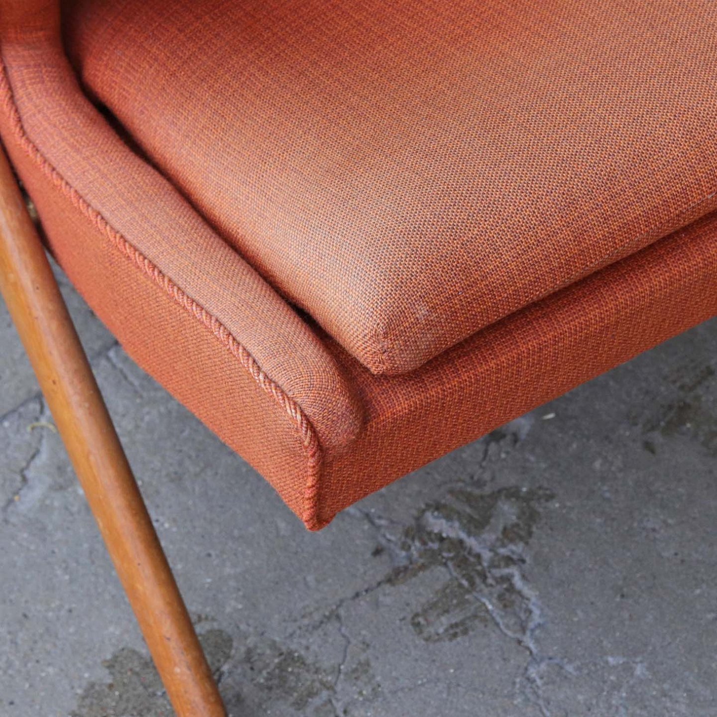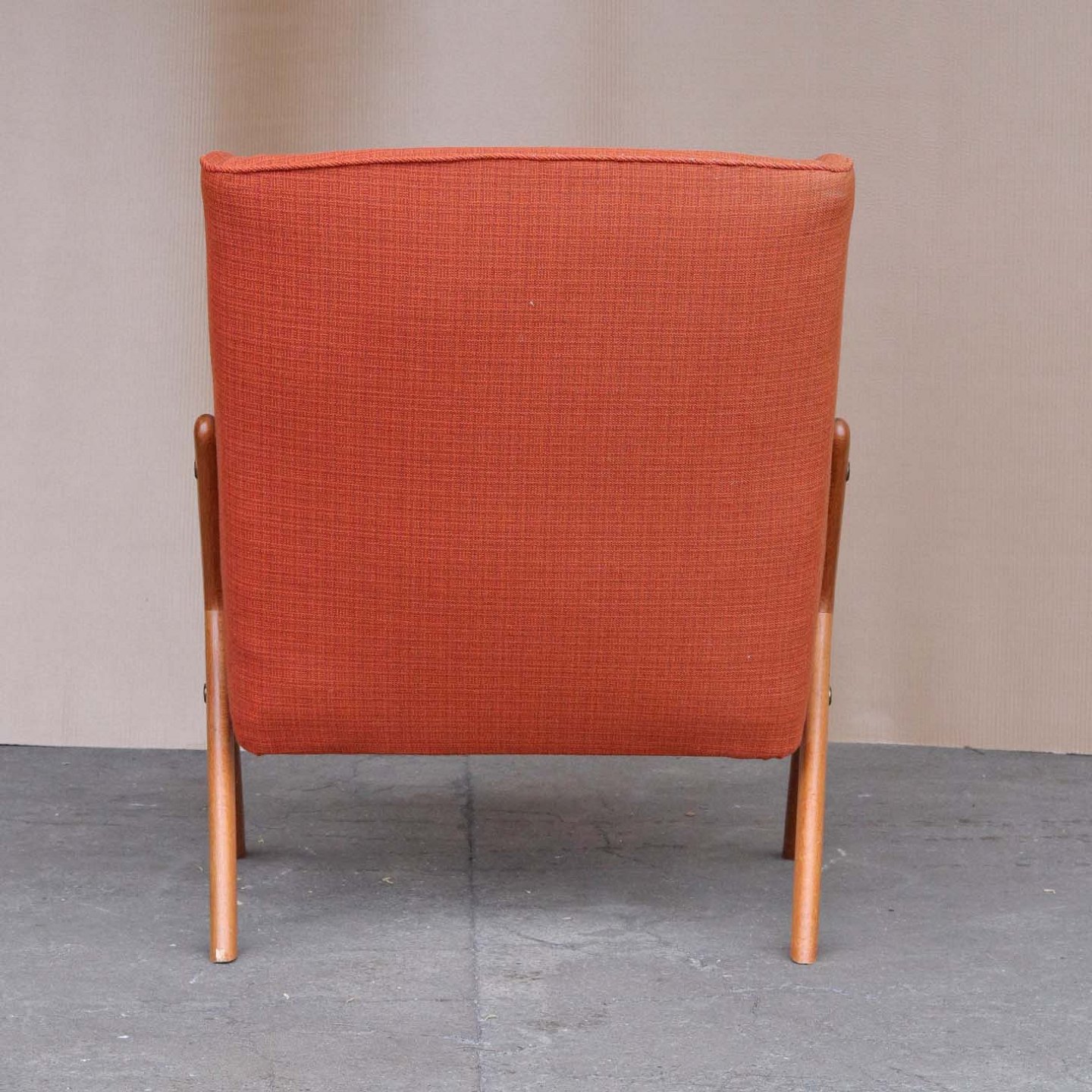 Beskrivelse: Lænestol fra 1950-60erne med stel i lakeret teaktræ. Stolen er betrukket med orange uldstof