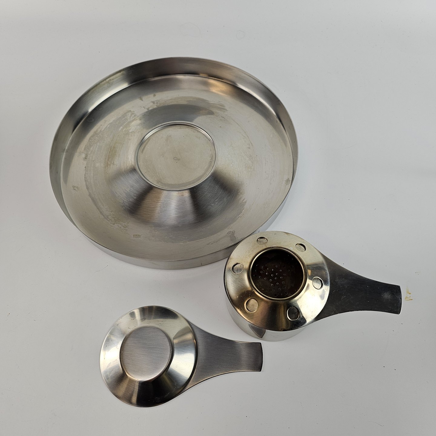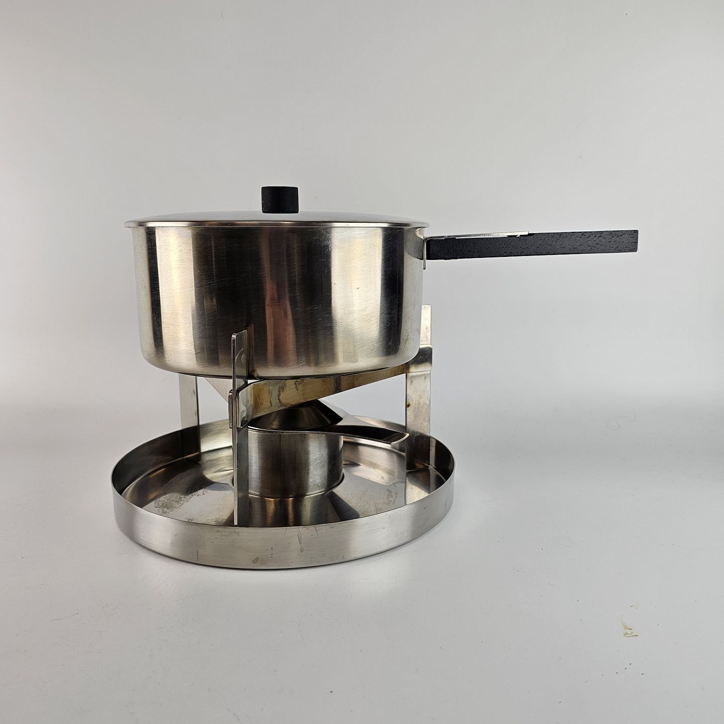 Beskrivelse: Stelton fonduesæt i rustfrit stål som indeholder med bakke, stander, brænder, gryde og låg. Model 500/2