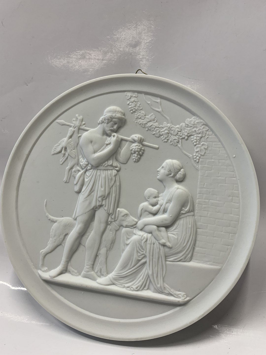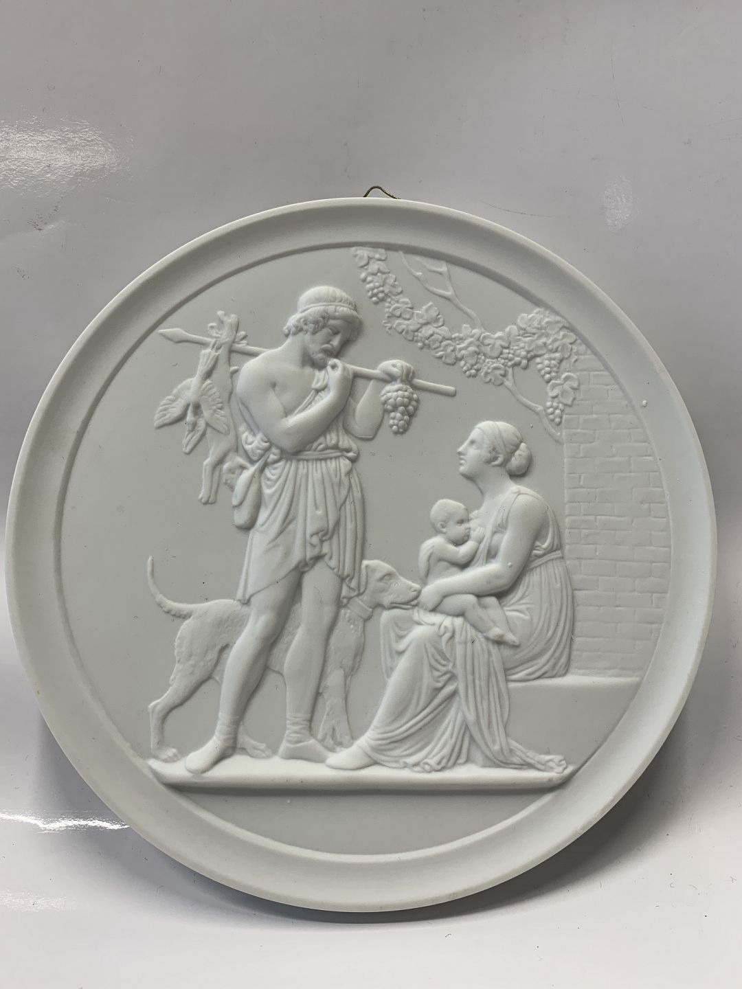 Beskrivelse: Royal Copenhagen Bisquit platte af Thorvaldsen "Mandom og efterår"