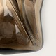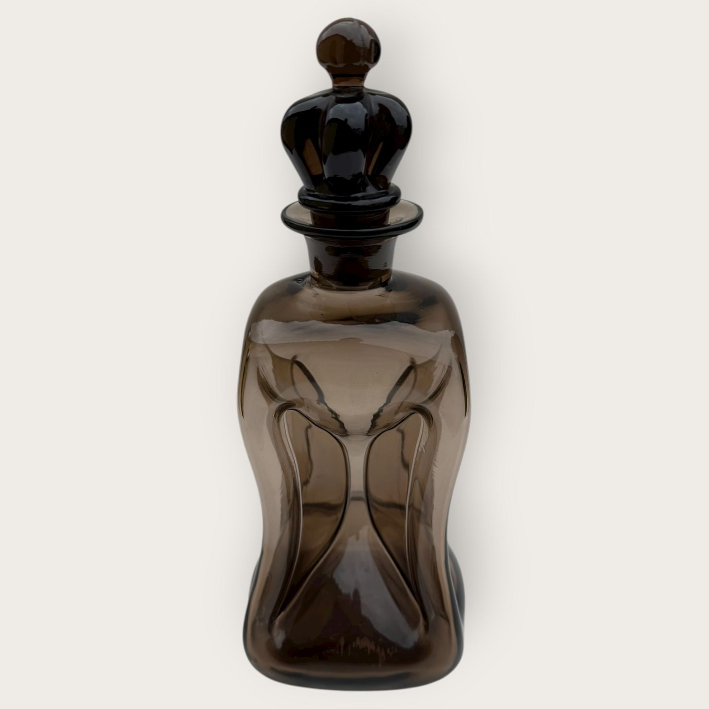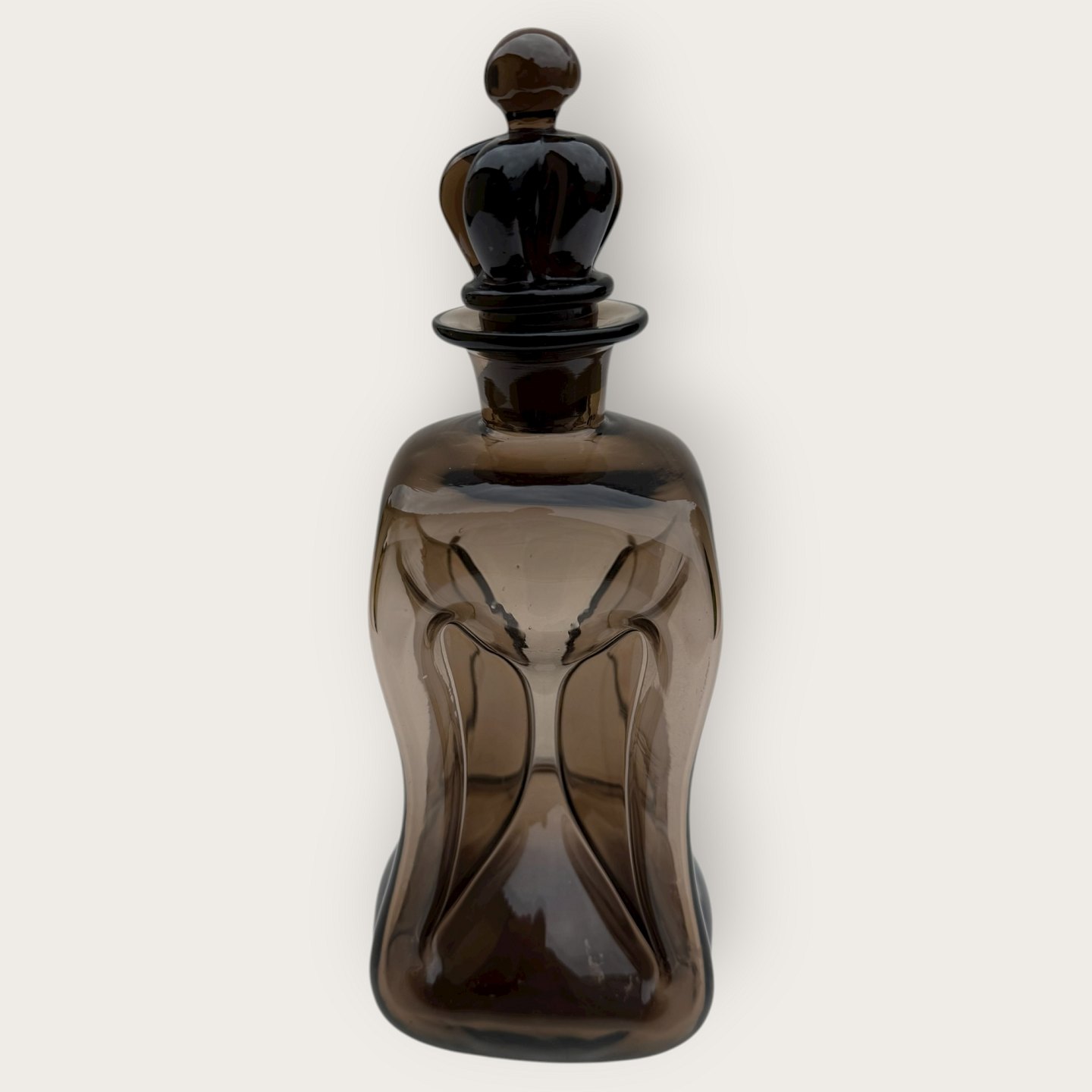 Beskrivelse: Holmegaard, klukflaske i brunt glas og med krone prop, Lille smule urenhed indvendigt i bunden ellers pæn stand, Mål: 26x10x10cm